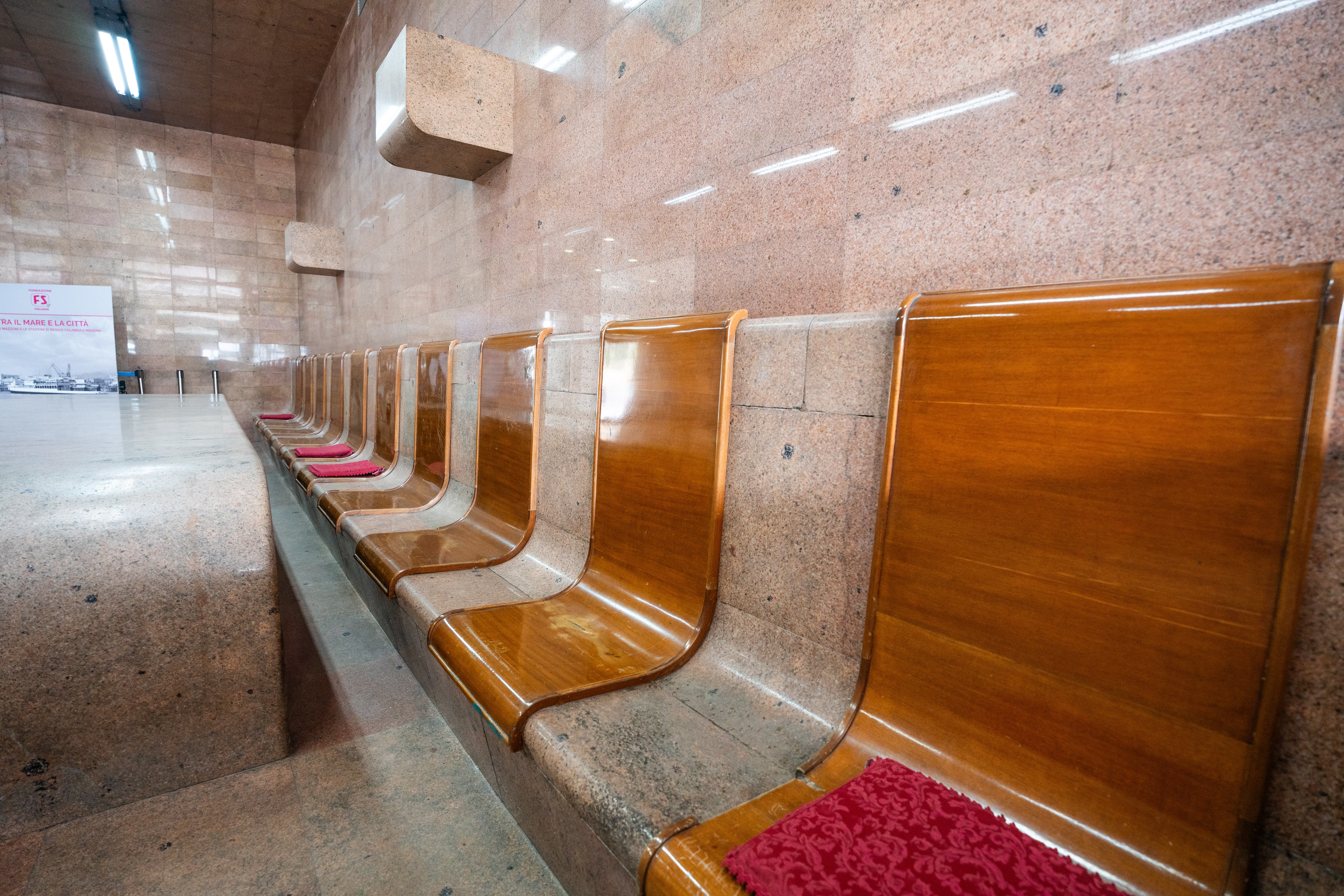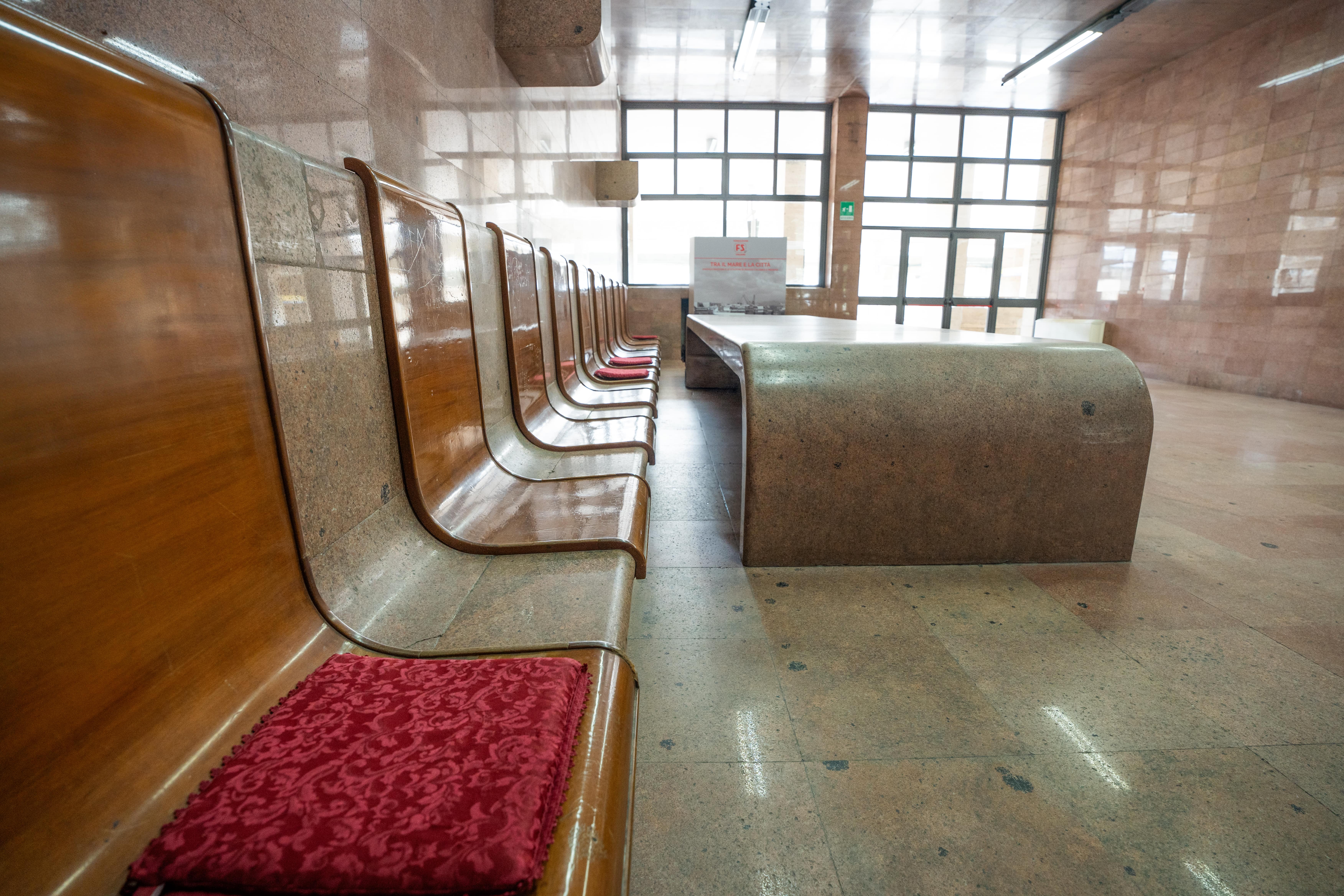 August 1937, work began, proceeding at a good pace. The new passenger building was constructed with a low body in travertine, enhanced by a futuristic canopy. Among the interior spaces, there is a waiting room dedicated to distinguished travelers, now called the "
