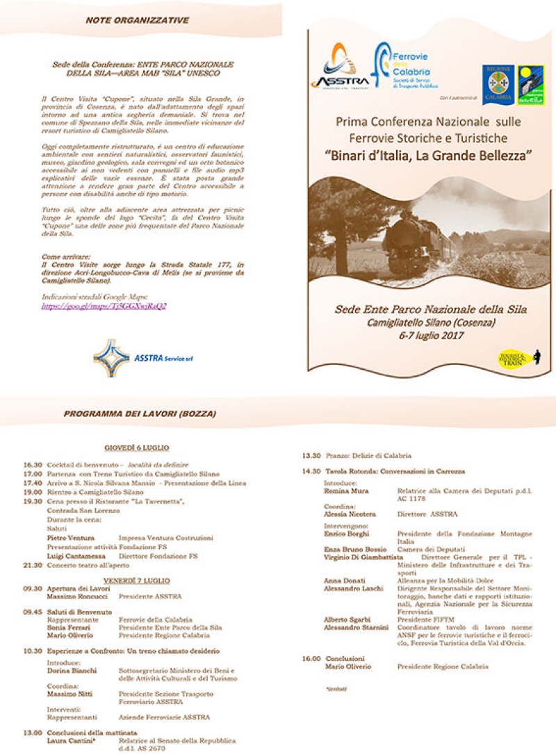 Il 6 e 7 luglio 2017, presso la sede dell’Ente Parco Nazionale della Sila a Camigliatello Silano (in provincia di Cosenza) si tiene il primo convegno nazionale sulle ferrovie storiche e turistiche. L’iniziativa è organizzata dalle Ferrovie della Calabria e dall’Associazione Trasporti e vede la partecipazione tra gli altri di Luigi Cantamessa, Direttore della Fondazione FS, a illustrare le “best practice” del principale player del settore. Ad anticipare la sessione dei dibattiti, le Ferrovie della Calabria offrono un viaggio turistico nel cuore del Parco Nazionale della Sila. Da Camigliatello Silano a San Nicola Silvana Mansio, la più alta stazione ferroviaria a scartamento ridotto d’Europa ad oltre 1400 metri d'altezza, lungo la tratta che, partendo da Moccone, è stata recentemente riaperta anche a scopi turistici e su cui è tornato a viaggiare il “Treno della Sila”.