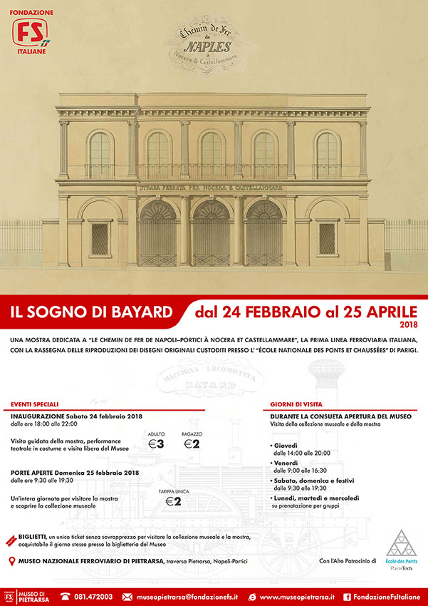 Venerdì 23 febbraio è stata presentata, nella Sala Giunta del Comune di Napoli, la mostra “Il Sogno di Bayard, Le chemin de fer de Napoli – Portici à Nocera et Castellammare” dedicata alla storica prima linea ferroviaria italiana. L'esposizione, allestita presso il suggestivo Padiglione "La Cattedrale", così chiamato per la caratteristica forma architettonica dei suoi interni, sarà inaugurata sabato 24 febbraio, alle ore 18.