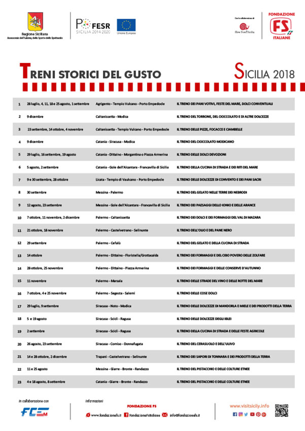 La Fondazione FS Italiane e la Regione Sicilia hanno messo “sui binari” un ricco programma di treni storici e turistici che percorreranno le linee ferroviarie più suggestive e panoramiche della Sicilia. La proposta segna, rispetto al 2017, un ulteriore passo in avanti nell’opera di valorizzazione delle linee turistiche siciliane e delle bellezze storiche e paesaggistiche con eventi che si svolgeranno stabilmente per tutta la durata del 2018.