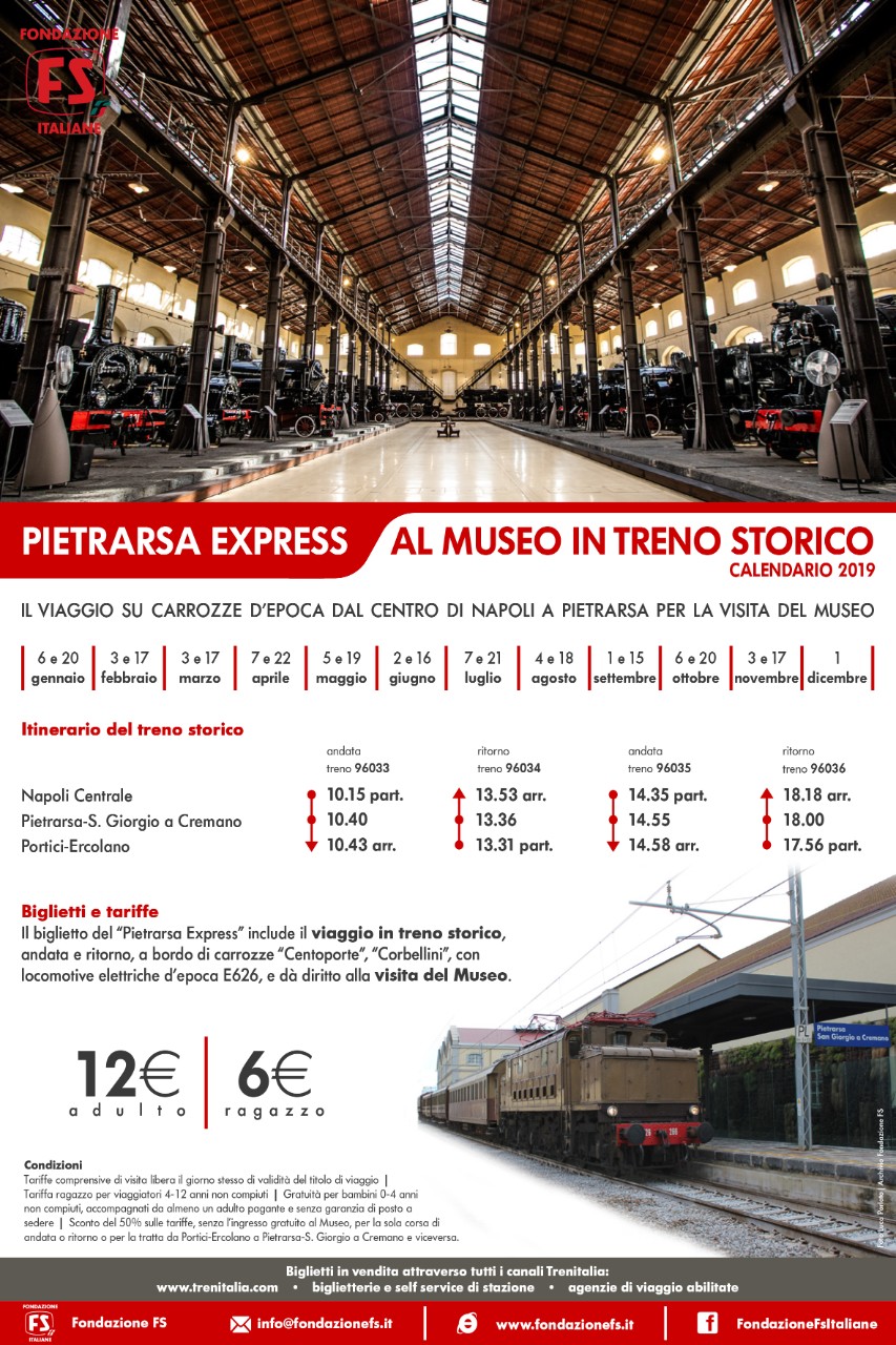 Due appuntamenti mensili per recarsi al Museo vivendo l’emozione di un viaggio a bordo di carrozze d’epoca "Centoporte" e “Corbellini”, trainate da una coppia di locomotive elettriche E626. Anche quest’anno, grazie al “Pietrarsa Express”, i turisti avranno modo di raggiungere il sito museale scegliendo tra le coppia di corse della mattina e del pomeriggio. L'itinerario proseguirà con la visita libera del Museo di Pietrarsa, inclusa nel biglietto ferroviario.